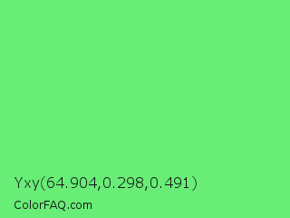 Yxy 64.904,0.298,0.491 Color is a light green color and the nearest color is Very Light Malachite Green #64e986. Hex code #68ed77 and RGB value is rgb(104,237,119). In RGB color space, this color is composed of 41% red, 93% green, 47% blue, In CMYK color space, this color is composed of 56% cyan, 0% magenta, 50% yellow , 7% black , In HSL color space, this color has a hue angle of 127° , 79% saturation and 67% lightness.