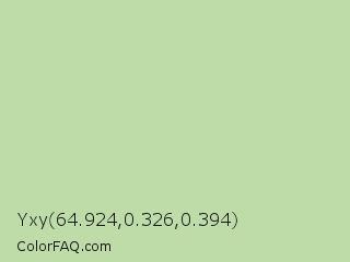 Yxy 64.924,0.326,0.394 Color is a light green color and the nearest color is Sprout #c1d7b0. Hex code #bedca7 and RGB value is rgb(190,220,167). In RGB color space, this color is composed of 75% red, 86% green, 65% blue, In CMYK color space, this color is composed of 14% cyan, 0% magenta, 24% yellow , 14% black , In HSL color space, this color has a hue angle of 94° , 43% saturation and 76% lightness.