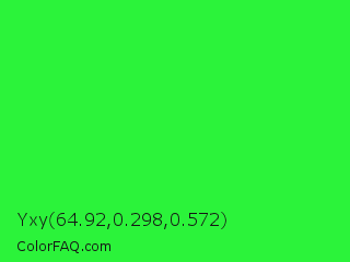 Yxy 64.92,0.298,0.572 Color is a normal green color and the nearest color is Lime Green #32cd32. Hex code #2bf33a and RGB value is rgb(43,243,58). In RGB color space, this color is composed of 17% red, 95% green, 23% blue, In CMYK color space, this color is composed of 82% cyan, 0% magenta, 76% yellow , 5% black , In HSL color space, this color has a hue angle of 125° , 89% saturation and 56% lightness.