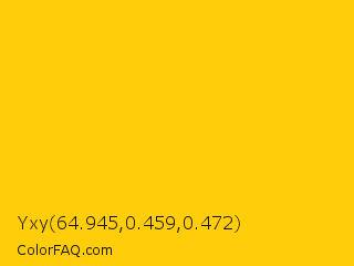 Yxy 64.945,0.459,0.472 Color is a normal yellow color and the nearest color is Mikado Yellow #ffc40c. Hex code #ffcd0a and RGB value is rgb(255,205,10). In RGB color space, this color is composed of 100% red, 80% green, 4% blue, In CMYK color space, this color is composed of 0% cyan, 20% magenta, 96% yellow , 0% black , In HSL color space, this color has a hue angle of 48° , 100% saturation and 52% lightness.