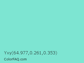 Yxy 64.977,0.261,0.353 Color is a light cyan color and the nearest color is Riptide #8be6d8. Hex code #7de5d2 and RGB value is rgb(125,229,210). In RGB color space, this color is composed of 49% red, 90% green, 82% blue, In CMYK color space, this color is composed of 45% cyan, 0% magenta, 8% yellow , 10% black , In HSL color space, this color has a hue angle of 169° , 67% saturation and 69% lightness.