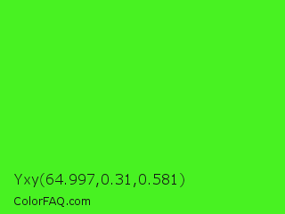 Yxy 64.997,0.31,0.581 Color is a normal green color and the nearest color is Neon Green #39ff14. Hex code #48f222 and RGB value is rgb(72,242,34). In RGB color space, this color is composed of 28% red, 95% green, 13% blue, In CMYK color space, this color is composed of 70% cyan, 0% magenta, 86% yellow , 5% black , In HSL color space, this color has a hue angle of 109° , 89% saturation and 54% lightness.