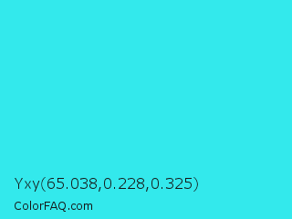 Yxy 65.038,0.228,0.325 Color is a normal cyan color and the nearest color is Turquoise #40e0d0. Hex code #33e9ec and RGB value is rgb(51,233,236). In RGB color space, this color is composed of 20% red, 91% green, 93% blue, In CMYK color space, this color is composed of 78% cyan, 1% magenta, 0% yellow , 7% black , In HSL color space, this color has a hue angle of 181° , 83% saturation and 56% lightness.