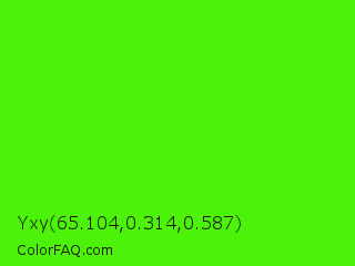 Yxy 65.104,0.314,0.587 Color is a normal green color and the nearest color is Chlorophyll Green #4aff00. Hex code #4cf209 and RGB value is rgb(76,242,9). In RGB color space, this color is composed of 30% red, 95% green, 4% blue, In CMYK color space, this color is composed of 69% cyan, 0% magenta, 96% yellow , 5% black , In HSL color space, this color has a hue angle of 103° , 93% saturation and 49% lightness.