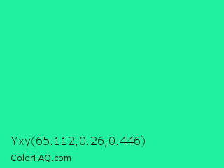 Yxy 65.112,0.26,0.446 Color is a normal green color and the nearest color is Medium Spring Green #00fa9a. Hex code #21f09e and RGB value is rgb(33,240,158). In RGB color space, this color is composed of 13% red, 94% green, 62% blue, In CMYK color space, this color is composed of 86% cyan, 0% magenta, 34% yellow , 6% black , In HSL color space, this color has a hue angle of 156° , 87% saturation and 54% lightness.