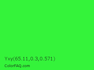 Yxy 65.11,0.3,0.571 Color is a normal green color and the nearest color is Lime Green #32cd32. Hex code #34f33a and RGB value is rgb(52,243,58). In RGB color space, this color is composed of 20% red, 95% green, 23% blue, In CMYK color space, this color is composed of 79% cyan, 0% magenta, 76% yellow , 5% black , In HSL color space, this color has a hue angle of 122° , 89% saturation and 58% lightness.