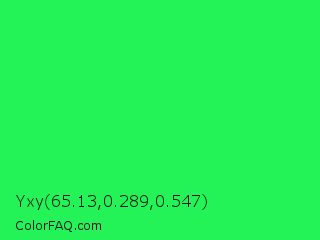 Yxy 65.13,0.289,0.547 Color is a normal green color and the nearest color is Malachite #0bda51. Hex code #23f356 and RGB value is rgb(35,243,86). In RGB color space, this color is composed of 14% red, 95% green, 34% blue, In CMYK color space, this color is composed of 86% cyan, 0% magenta, 65% yellow , 5% black , In HSL color space, this color has a hue angle of 135° , 90% saturation and 55% lightness.
