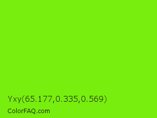 Yxy 65.177,0.335,0.569 Color is a normal green color and the nearest color is Lawn Green #7cfc00. Hex code #78ee0f and RGB value is rgb(120,238,15). In RGB color space, this color is composed of 47% red, 93% green, 6% blue, In CMYK color space, this color is composed of 50% cyan, 0% magenta, 94% yellow , 7% black , In HSL color space, this color has a hue angle of 92° , 88% saturation and 50% lightness.