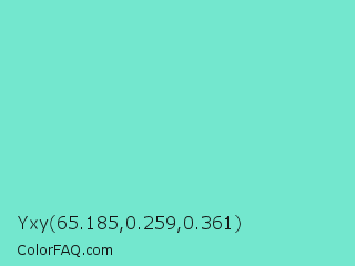 Yxy 65.185,0.259,0.361 Color is a light cyan color and the nearest color is Bermuda #7dd8c6. Hex code #73e7ce and RGB value is rgb(115,231,206). In RGB color space, this color is composed of 45% red, 91% green, 81% blue, In CMYK color space, this color is composed of 50% cyan, 0% magenta, 11% yellow , 9% black , In HSL color space, this color has a hue angle of 167° , 71% saturation and 68% lightness.