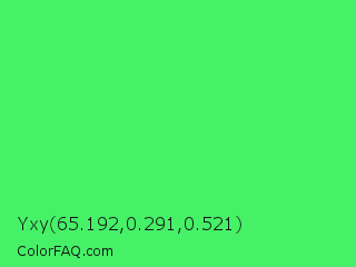 Yxy 65.192,0.291,0.521 Color is a light green color and the nearest color is Screamin Green #66ff66. Hex code #46f167 and RGB value is rgb(70,241,103). In RGB color space, this color is composed of 27% red, 95% green, 40% blue, In CMYK color space, this color is composed of 71% cyan, 0% magenta, 57% yellow , 5% black , In HSL color space, this color has a hue angle of 132° , 86% saturation and 61% lightness.