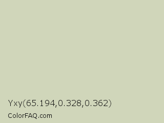 Yxy 65.194,0.328,0.362 Color is a light lime color and the nearest color is Sisal #d3cbba. Hex code #d0d6ba and RGB value is rgb(208,214,186). In RGB color space, this color is composed of 82% red, 84% green, 73% blue, In CMYK color space, this color is composed of 3% cyan, 0% magenta, 13% yellow , 16% black , In HSL color space, this color has a hue angle of 73° , 25% saturation and 78% lightness.