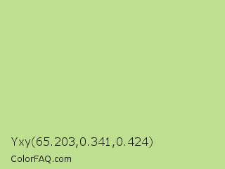 Yxy 65.203,0.341,0.424 Color is a light green color and the nearest color is Medium Spring Bud #c9dc87. Hex code #bede90 and RGB value is rgb(190,222,144). In RGB color space, this color is composed of 75% red, 87% green, 56% blue, In CMYK color space, this color is composed of 14% cyan, 0% magenta, 35% yellow , 13% black , In HSL color space, this color has a hue angle of 85° , 54% saturation and 72% lightness.