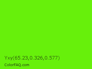 Yxy 65.23,0.326,0.577 Color is a normal green color and the nearest color is Bright Green #66ff00. Hex code #67f00b and RGB value is rgb(103,240,11). In RGB color space, this color is composed of 40% red, 94% green, 4% blue, In CMYK color space, this color is composed of 57% cyan, 0% magenta, 95% yellow , 6% black , In HSL color space, this color has a hue angle of 96° , 91% saturation and 49% lightness.
