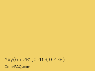Yxy 65.281,0.413,0.438 Color is a light yellow color and the nearest color is Orange Yellow #f8d568. Hex code #f1d167 and RGB value is rgb(241,209,103). In RGB color space, this color is composed of 95% red, 82% green, 40% blue, In CMYK color space, this color is composed of 0% cyan, 13% magenta, 57% yellow , 5% black , In HSL color space, this color has a hue angle of 46° , 83% saturation and 67% lightness.