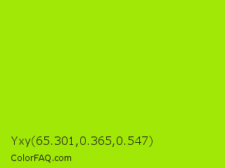 Yxy 65.301,0.365,0.547 Color is a normal lime color and the nearest color is Vivid Lime Green #a6d608. Hex code #a1e807 and RGB value is rgb(161,232,7). In RGB color space, this color is composed of 63% red, 91% green, 3% blue, In CMYK color space, this color is composed of 31% cyan, 0% magenta, 97% yellow , 9% black , In HSL color space, this color has a hue angle of 79° , 94% saturation and 47% lightness.