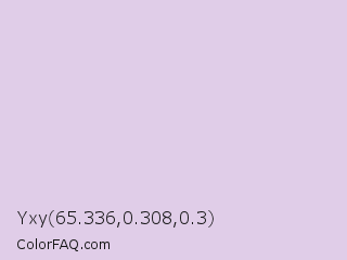 Yxy 65.336,0.308,0.3 Color is a very light purple color and the nearest color is Twilight #e4cfde. Hex code #e0cde8 and RGB value is rgb(224,205,232). In RGB color space, this color is composed of 88% red, 80% green, 91% blue, In CMYK color space, this color is composed of 3% cyan, 12% magenta, 0% yellow , 9% black , In HSL color space, this color has a hue angle of 282° , 37% saturation and 86% lightness.