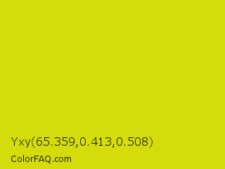 Yxy 65.359,0.413,0.508 Color is a normal yellow color and the nearest color is Bitter Lemon #cae00d. Hex code #d5dc0c and RGB value is rgb(213,220,12). In RGB color space, this color is composed of 84% red, 86% green, 5% blue, In CMYK color space, this color is composed of 3% cyan, 0% magenta, 95% yellow , 14% black , In HSL color space, this color has a hue angle of 62° , 90% saturation and 45% lightness.