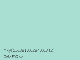 Yxy 65.381,0.284,0.342 Color is a light cyan color and the nearest color is Aqua Island #a1dad7. Hex code #a9ded3 and RGB value is rgb(169,222,211). In RGB color space, this color is composed of 66% red, 87% green, 83% blue, In CMYK color space, this color is composed of 24% cyan, 0% magenta, 5% yellow , 13% black , In HSL color space, this color has a hue angle of 168° , 45% saturation and 77% lightness.