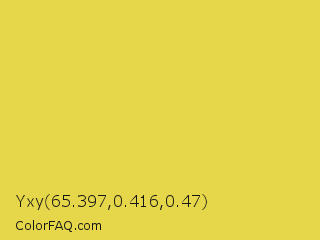 Yxy 65.397,0.416,0.47 Color is a normal yellow color and the nearest color is Wattle #dcd747. Hex code #e6d649 and RGB value is rgb(230,214,73). In RGB color space, this color is composed of 90% red, 84% green, 29% blue, In CMYK color space, this color is composed of 0% cyan, 7% magenta, 68% yellow , 10% black , In HSL color space, this color has a hue angle of 54° , 76% saturation and 59% lightness.