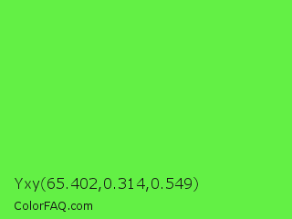 Yxy 65.402,0.314,0.549 Color is a light green color and the nearest color is Screamin Green #66ff66. Hex code #63f045 and RGB value is rgb(99,240,69). In RGB color space, this color is composed of 39% red, 94% green, 27% blue, In CMYK color space, this color is composed of 59% cyan, 0% magenta, 71% yellow , 6% black , In HSL color space, this color has a hue angle of 109° , 85% saturation and 61% lightness.