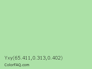 Yxy 65.411,0.313,0.402 Color is a light green color and the nearest color is Moss Green #addfad. Hex code #ace1a7 and RGB value is rgb(172,225,167). In RGB color space, this color is composed of 67% red, 88% green, 65% blue, In CMYK color space, this color is composed of 24% cyan, 0% magenta, 26% yellow , 12% black , In HSL color space, this color has a hue angle of 115° , 49% saturation and 77% lightness.