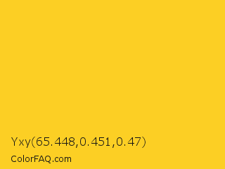 Yxy 65.448,0.451,0.47 Color is a normal yellow color and the nearest color is Ripe Lemon #f4d81c. Hex code #fccf24 and RGB value is rgb(252,207,36). In RGB color space, this color is composed of 99% red, 81% green, 14% blue, In CMYK color space, this color is composed of 0% cyan, 18% magenta, 86% yellow , 1% black , In HSL color space, this color has a hue angle of 48° , 97% saturation and 56% lightness.