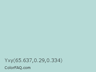 Yxy 65.637,0.29,0.334 Color is a light cyan color and the nearest color is Jet Stream #b5d2ce. Hex code #b6dbd7 and RGB value is rgb(182,219,215). In RGB color space, this color is composed of 71% red, 86% green, 84% blue, In CMYK color space, this color is composed of 17% cyan, 0% magenta, 2% yellow , 14% black , In HSL color space, this color has a hue angle of 174° , 34% saturation and 79% lightness.