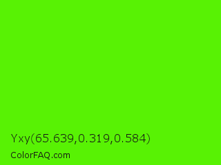 Yxy 65.639,0.319,0.584 Color is a normal green color and the nearest color is Bright Green #66ff00. Hex code #58f204 and RGB value is rgb(88,242,4). In RGB color space, this color is composed of 35% red, 95% green, 2% blue, In CMYK color space, this color is composed of 64% cyan, 0% magenta, 98% yellow , 5% black , In HSL color space, this color has a hue angle of 99° , 97% saturation and 48% lightness.
