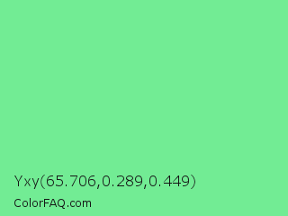 Yxy 65.706,0.289,0.449 Color is a light green color and the nearest color is Very Light Malachite Green #64e986. Hex code #72ec94 and RGB value is rgb(114,236,148). In RGB color space, this color is composed of 45% red, 93% green, 58% blue, In CMYK color space, this color is composed of 52% cyan, 0% magenta, 37% yellow , 7% black , In HSL color space, this color has a hue angle of 137° , 76% saturation and 69% lightness.