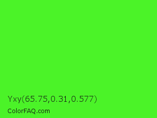 Yxy 65.75,0.31,0.577 Color is a normal green color and the nearest color is Neon Green #39ff14. Hex code #4bf328 and RGB value is rgb(75,243,40). In RGB color space, this color is composed of 29% red, 95% green, 16% blue, In CMYK color space, this color is composed of 69% cyan, 0% magenta, 84% yellow , 5% black , In HSL color space, this color has a hue angle of 110° , 89% saturation and 55% lightness.