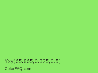 Yxy 65.865,0.325,0.5 Color is a light green color and the nearest color is Pastel Green #77dd77. Hex code #8beb66 and RGB value is rgb(139,235,102). In RGB color space, this color is composed of 55% red, 92% green, 40% blue, In CMYK color space, this color is composed of 41% cyan, 0% magenta, 57% yellow , 8% black , In HSL color space, this color has a hue angle of 103° , 77% saturation and 66% lightness.