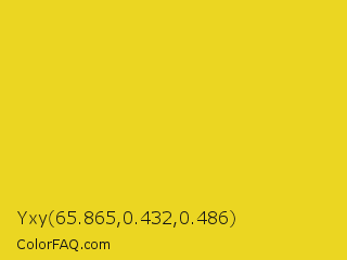 Yxy 65.865,0.432,0.486 Color is a normal yellow color and the nearest color is Sunflower #e4d422. Hex code #ebd622 and RGB value is rgb(235,214,34). In RGB color space, this color is composed of 92% red, 84% green, 13% blue, In CMYK color space, this color is composed of 0% cyan, 9% magenta, 86% yellow , 8% black , In HSL color space, this color has a hue angle of 54° , 83% saturation and 53% lightness.