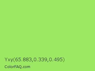 Yxy 65.883,0.339,0.495 Color is a light green color and the nearest color is Inchworm #b2ec5d. Hex code #9de863 and RGB value is rgb(157,232,99). In RGB color space, this color is composed of 62% red, 91% green, 39% blue, In CMYK color space, this color is composed of 32% cyan, 0% magenta, 57% yellow , 9% black , In HSL color space, this color has a hue angle of 94° , 74% saturation and 65% lightness.