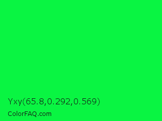 Yxy 65.8,0.292,0.569 Color is a normal green color and the nearest color is Malachite #0bda51. Hex code #09f542 and RGB value is rgb(9,245,66). In RGB color space, this color is composed of 4% red, 96% green, 26% blue, In CMYK color space, this color is composed of 96% cyan, 0% magenta, 73% yellow , 4% black , In HSL color space, this color has a hue angle of 134° , 93% saturation and 50% lightness.