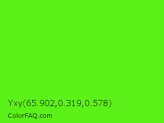 Yxy 65.902,0.319,0.578 Color is a normal green color and the nearest color is Bright Green #66ff00. Hex code #5cf219 and RGB value is rgb(92,242,25). In RGB color space, this color is composed of 36% red, 95% green, 10% blue, In CMYK color space, this color is composed of 62% cyan, 0% magenta, 90% yellow , 5% black , In HSL color space, this color has a hue angle of 101° , 89% saturation and 52% lightness.