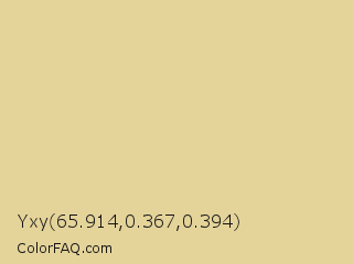 Yxy 65.914,0.367,0.394 Color is a light yellow color and the nearest color is Zombie #e4d69b. Hex code #e4d49a and RGB value is rgb(228,212,154). In RGB color space, this color is composed of 89% red, 83% green, 60% blue, In CMYK color space, this color is composed of 0% cyan, 7% magenta, 32% yellow , 11% black , In HSL color space, this color has a hue angle of 47° , 58% saturation and 75% lightness.