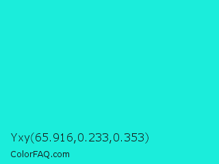 Yxy 65.916,0.233,0.353 Color is a normal cyan color and the nearest color is Bright Turquoise #08e8de. Hex code #1beddb and RGB value is rgb(27,237,219). In RGB color space, this color is composed of 11% red, 93% green, 86% blue, In CMYK color space, this color is composed of 89% cyan, 0% magenta, 8% yellow , 7% black , In HSL color space, this color has a hue angle of 175° , 85% saturation and 52% lightness.