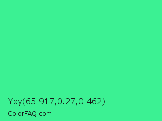 Yxy 65.917,0.27,0.462 Color is a normal green color and the nearest color is Eucalyptus #44d7a8. Hex code #3bf193 and RGB value is rgb(59,241,147). In RGB color space, this color is composed of 23% red, 95% green, 58% blue, In CMYK color space, this color is composed of 76% cyan, 0% magenta, 39% yellow , 5% black , In HSL color space, this color has a hue angle of 149° , 87% saturation and 59% lightness.