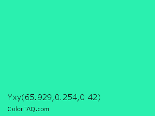 Yxy 65.929,0.254,0.42 Color is a normal green color and the nearest color is Eucalyptus #44d7a8. Hex code #2af0af and RGB value is rgb(42,240,175). In RGB color space, this color is composed of 16% red, 94% green, 69% blue, In CMYK color space, this color is composed of 83% cyan, 0% magenta, 27% yellow , 6% black , In HSL color space, this color has a hue angle of 160° , 87% saturation and 55% lightness.