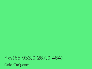 Yxy 65.953,0.287,0.484 Color is a light green color and the nearest color is Very Light Malachite Green #64e986. Hex code #58f080 and RGB value is rgb(88,240,128). In RGB color space, this color is composed of 35% red, 94% green, 50% blue, In CMYK color space, this color is composed of 63% cyan, 0% magenta, 47% yellow , 6% black , In HSL color space, this color has a hue angle of 136° , 84% saturation and 64% lightness.