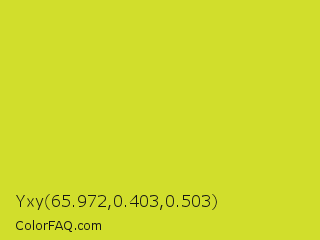 Yxy 65.972,0.403,0.503 Color is a normal yellow color and the nearest color is Pear #d1e231. Hex code #d1de2c and RGB value is rgb(209,222,44). In RGB color space, this color is composed of 82% red, 87% green, 17% blue, In CMYK color space, this color is composed of 6% cyan, 0% magenta, 80% yellow , 13% black , In HSL color space, this color has a hue angle of 64° , 73% saturation and 52% lightness.