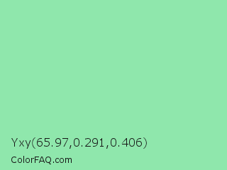 Yxy 65.97,0.291,0.406 Color is a light green color and the nearest color is Teal Deer #99e6b3. Hex code #8fe7ac and RGB value is rgb(143,231,172). In RGB color space, this color is composed of 56% red, 91% green, 67% blue, In CMYK color space, this color is composed of 38% cyan, 0% magenta, 26% yellow , 9% black , In HSL color space, this color has a hue angle of 140° , 65% saturation and 73% lightness.
