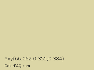 Yxy 66.062,0.351,0.384 Color is a light yellow color and the nearest color is Sapling #ded4a4. Hex code #dcd6a6 and RGB value is rgb(220,214,166). In RGB color space, this color is composed of 86% red, 84% green, 65% blue, In CMYK color space, this color is composed of 0% cyan, 3% magenta, 25% yellow , 14% black , In HSL color space, this color has a hue angle of 53° , 44% saturation and 76% lightness.