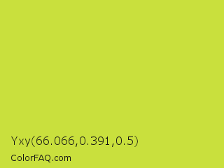 Yxy 66.066,0.391,0.5 Color is a normal yellow color and the nearest color is Pear #d1e231. Hex code #c9e03d and RGB value is rgb(201,224,61). In RGB color space, this color is composed of 79% red, 88% green, 24% blue, In CMYK color space, this color is composed of 10% cyan, 0% magenta, 73% yellow , 12% black , In HSL color space, this color has a hue angle of 68° , 72% saturation and 56% lightness.