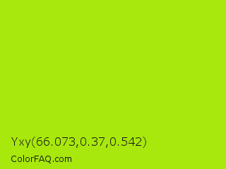 Yxy 66.073,0.37,0.542 Color is a normal lime color and the nearest color is Inch Worm #b0e313. Hex code #a8e80c and RGB value is rgb(168,232,12). In RGB color space, this color is composed of 66% red, 91% green, 5% blue, In CMYK color space, this color is composed of 28% cyan, 0% magenta, 95% yellow , 9% black , In HSL color space, this color has a hue angle of 77° , 90% saturation and 48% lightness.