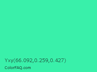 Yxy 66.092,0.259,0.427 Color is a normal green color and the nearest color is Eucalyptus #44d7a8. Hex code #39f0aa and RGB value is rgb(57,240,170). In RGB color space, this color is composed of 22% red, 94% green, 67% blue, In CMYK color space, this color is composed of 76% cyan, 0% magenta, 29% yellow , 6% black , In HSL color space, this color has a hue angle of 157° , 86% saturation and 58% lightness.