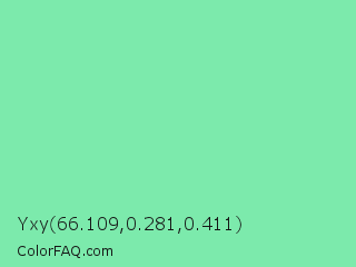 Yxy 66.109,0.281,0.411 Color is a light green color and the nearest color is Medium Aquamarine #66ddaa. Hex code #7ceaac and RGB value is rgb(124,234,172). In RGB color space, this color is composed of 49% red, 92% green, 67% blue, In CMYK color space, this color is composed of 47% cyan, 0% magenta, 26% yellow , 8% black , In HSL color space, this color has a hue angle of 146° , 72% saturation and 70% lightness.