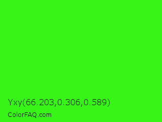 Yxy 66.203,0.306,0.589 Color is a normal green color and the nearest color is Neon Green #39ff14. Hex code #37f517 and RGB value is rgb(55,245,23). In RGB color space, this color is composed of 22% red, 96% green, 9% blue, In CMYK color space, this color is composed of 78% cyan, 0% magenta, 91% yellow , 4% black , In HSL color space, this color has a hue angle of 111° , 92% saturation and 53% lightness.