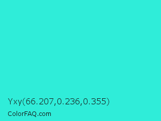 Yxy 66.207,0.236,0.355 Color is a normal cyan color and the nearest color is Turquoise #40e0d0. Hex code #2fedd9 and RGB value is rgb(47,237,217). In RGB color space, this color is composed of 18% red, 93% green, 85% blue, In CMYK color space, this color is composed of 80% cyan, 0% magenta, 8% yellow , 7% black , In HSL color space, this color has a hue angle of 174° , 84% saturation and 56% lightness.