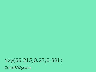 Yxy 66.215,0.27,0.391 Color is a light green color and the nearest color is Bermuda #7dd8c6. Hex code #75eabb and RGB value is rgb(117,234,187). In RGB color space, this color is composed of 46% red, 92% green, 73% blue, In CMYK color space, this color is composed of 50% cyan, 0% magenta, 20% yellow , 8% black , In HSL color space, this color has a hue angle of 156° , 74% saturation and 69% lightness.